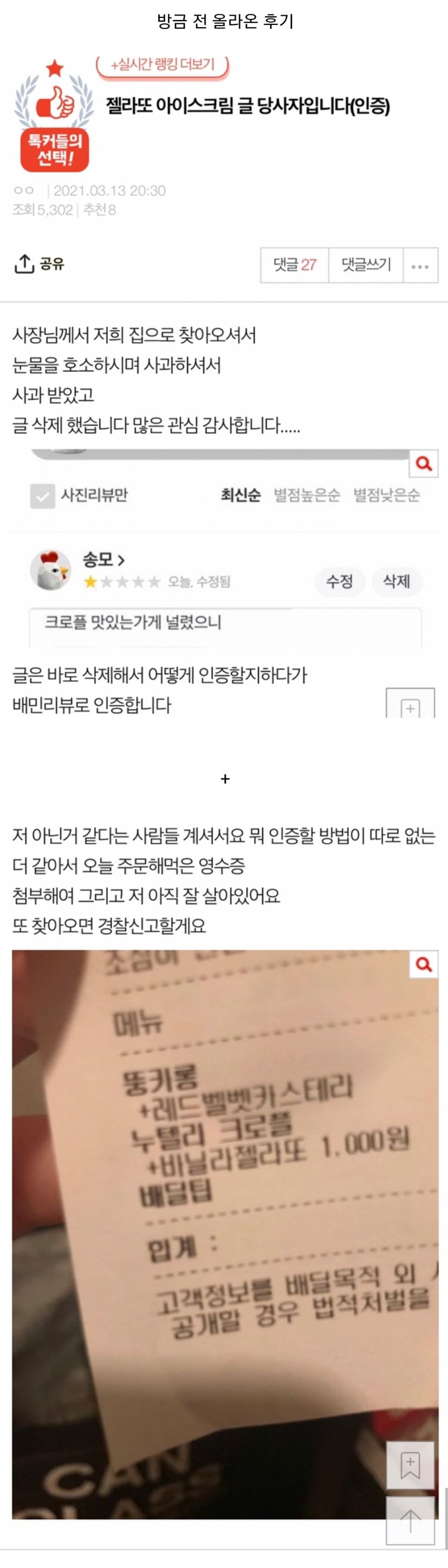 내놨다. 이에 작성자는 젤라또 표기를 아이스크림으로 바꾸면 되는 것 아니냐는 내용으로 리뷰를 고쳤다.