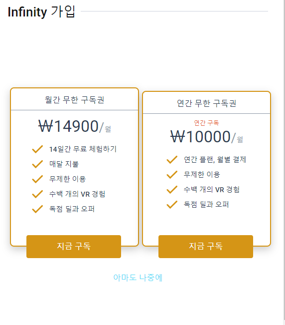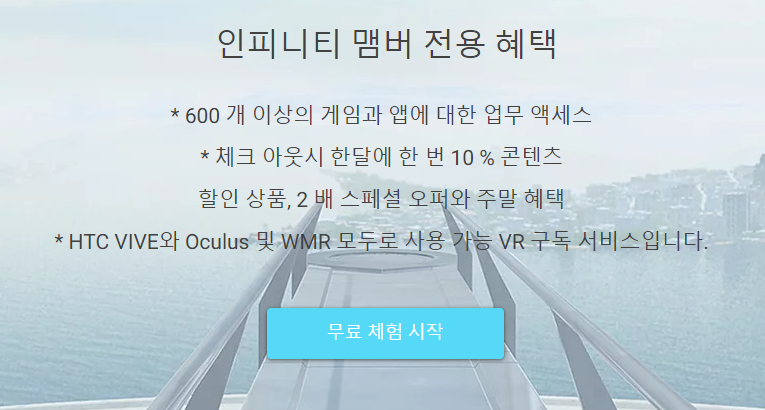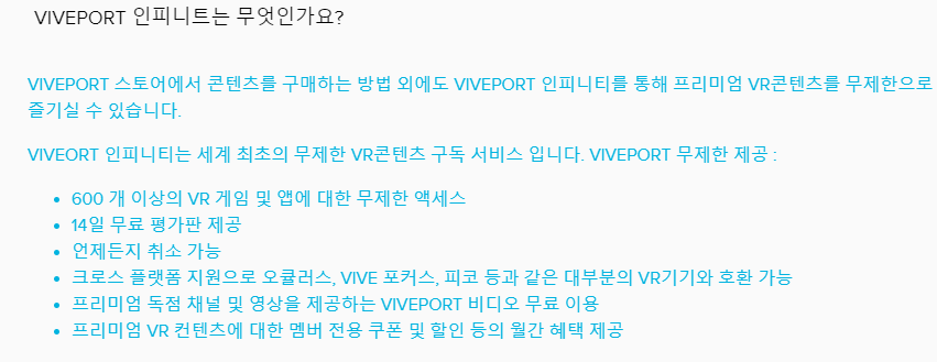 VIVEPORT 인피니트는 무엇인가요? VIVEPORT 스토어에서 콘텐츠를 구매하는 방법 외에도 VIVEPORT 인피니티를 통해 프리미엄 VR콘텐츠를 무제한으로 즐기실 수 있습니다. VIVEORT 인피니티는 세계 최초의
